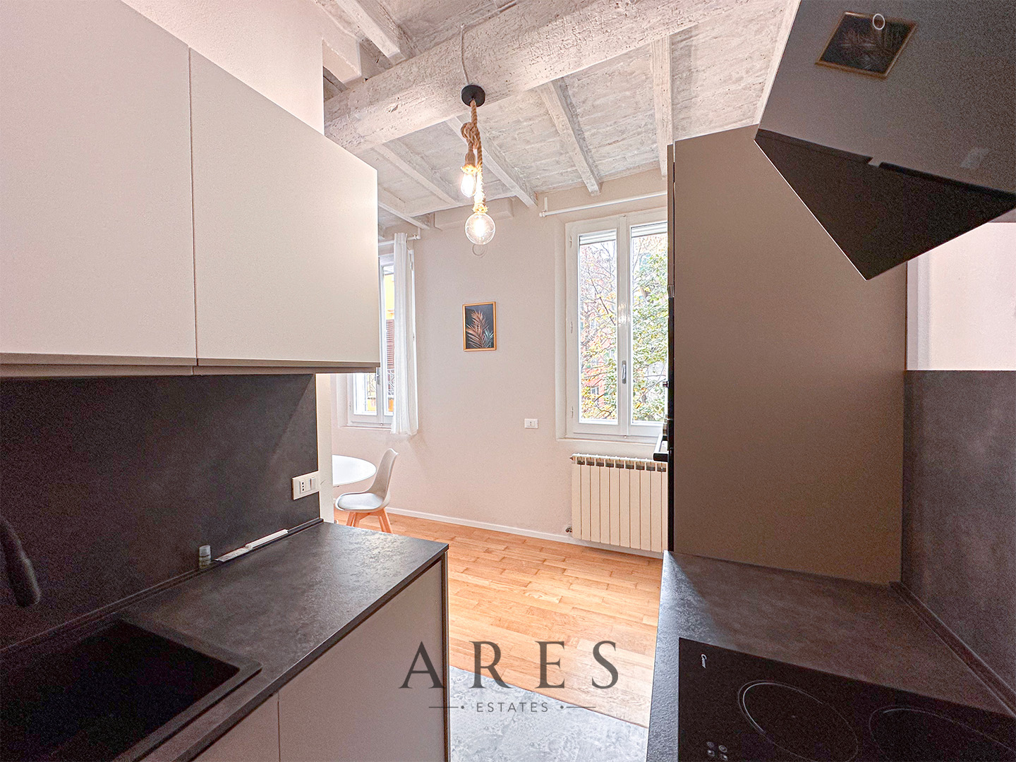 • Angolo cottura open space in soggiorno con quattro finestre sul fronte strada