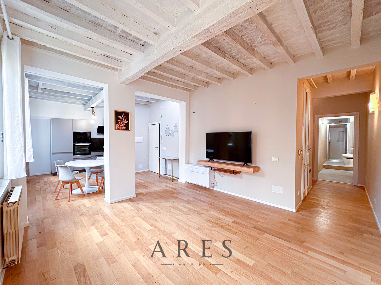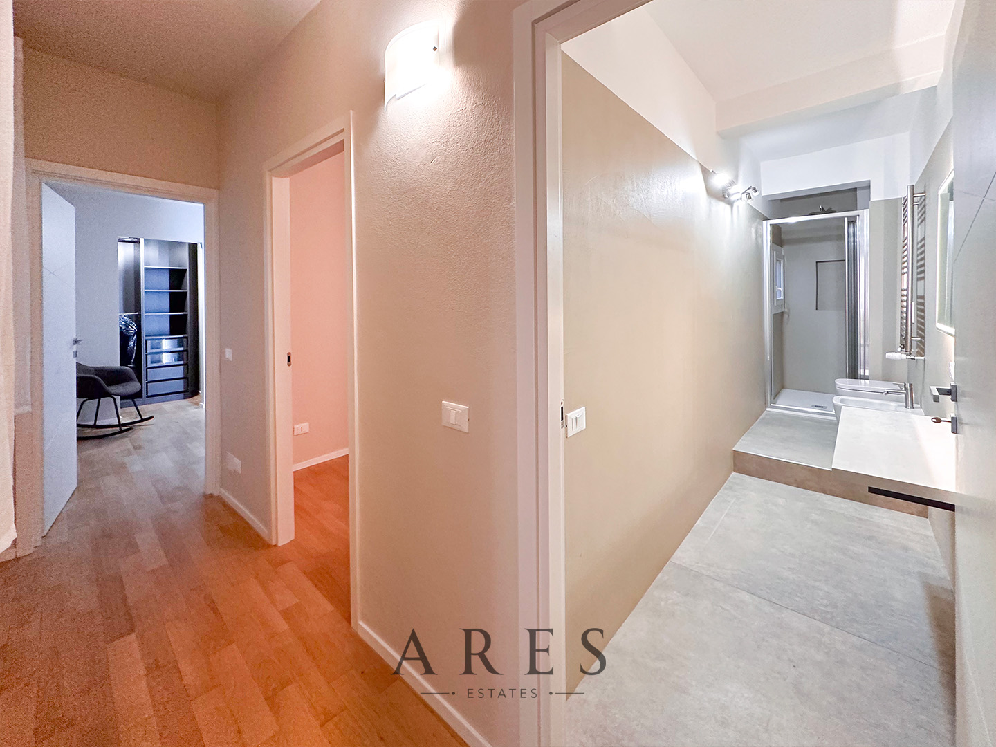 Pavimenti in legno essenza rovere, porte laccate bianche, impianto di condizionamento, bagni completamente rifatti con pavimenti in ceramica e resina, finestre con doppio vetro, caldaia a condensazione.